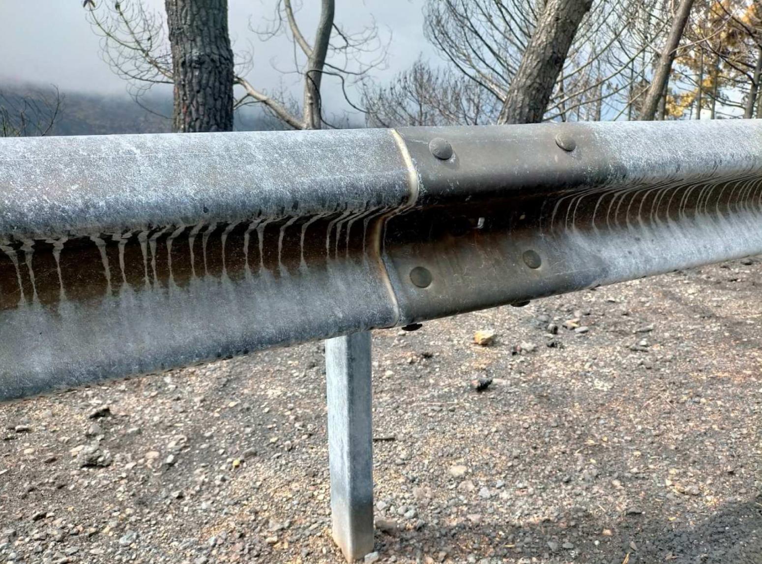 Precisamente, los sistemas de contención fueron uno de los elementos más afectados por el incendio, dado que al tratarse de carreteras de montaña con importantes desniveles están presentes en la totalidad del trazado en al menos una de sus márgenes. La incidencia directa del fuego sobre las barreras de seguridad y las altas temperaturas a las que estuvieron sometidas ocasionaron, por un lado, la pérdida de la protección anticorrosiva (galvanizado) y, por otro lado, la dilatación en exceso de la mismas, que al ser un elemento continuo, atornillado, ha cedido en algunos puntos, llegando a movilizar los postes de anclaje al terreno y provocando curvaturas en el perfil de la barrera, disminuyendo el nivel de contención.