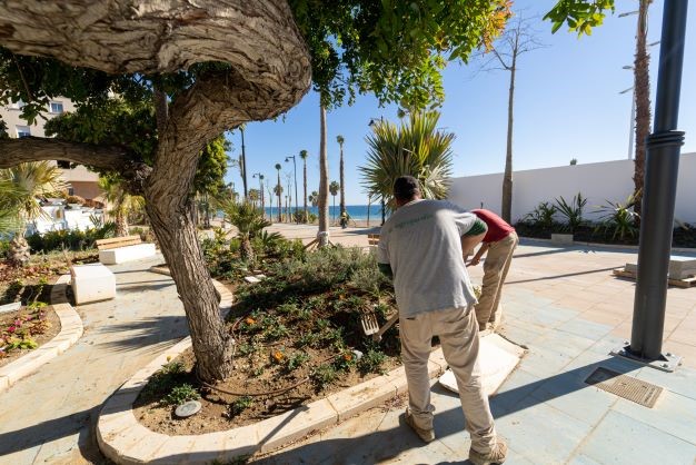 Por lo que respecta al segundo tramo que Agrojardín Landscaping está ultimando estos días previos a la inauguración oficial, que también incluye la antigua nacional 340 que queda peatonalizada y parte del paseo marítimo, aquí ya existía vegetación anterior con ejemplares como grandes ficus y palmeras que se han mantenido. La actuación de jardinería ha consistido en este caso en una reestructuración y adecuación de los mismos al nuevo espacio, así como la colocación de flores de temporada y plantas arbustivas. Este segundo trayecto que queda ahora está más enfocado a crear zonas de juegos infantiles de distintas edades y áreas biosaludables.
