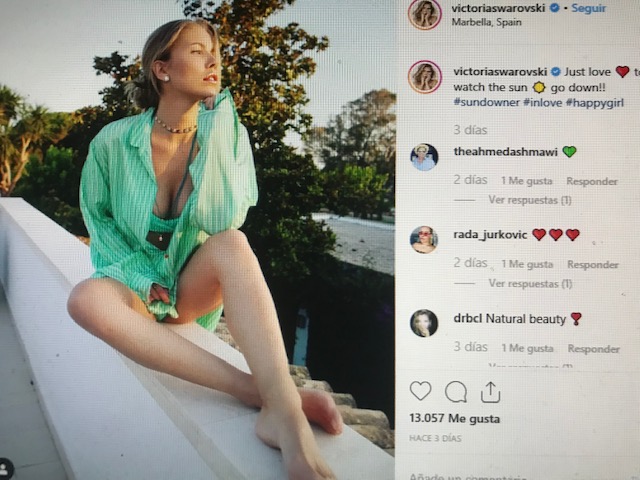Según informa EL CONFIDENCIAL, Victoria Swarovski( 25 años), la heredera del imperio de cristales, está de vacaciones en Marbella. Junto a su marido, Werner Mürz, la cantante ha cambiado Austria por unos días en la Costa del Sol. Y ha hecho multitud de selfies, tomando el sol y disfrutando de las terrazas de Puerto Banús. Esta mujer es tremendamente popular en la Europa Central. Sólo en su cuenta tiene más de 366.000 seguidores de todo el mundo. Meses atrás ya estuvo en Marbella, ciudad de la que se ha enamorado y a la que llama «My paradise». Indiscutiblemente una promoción extra impagable para Marbella.