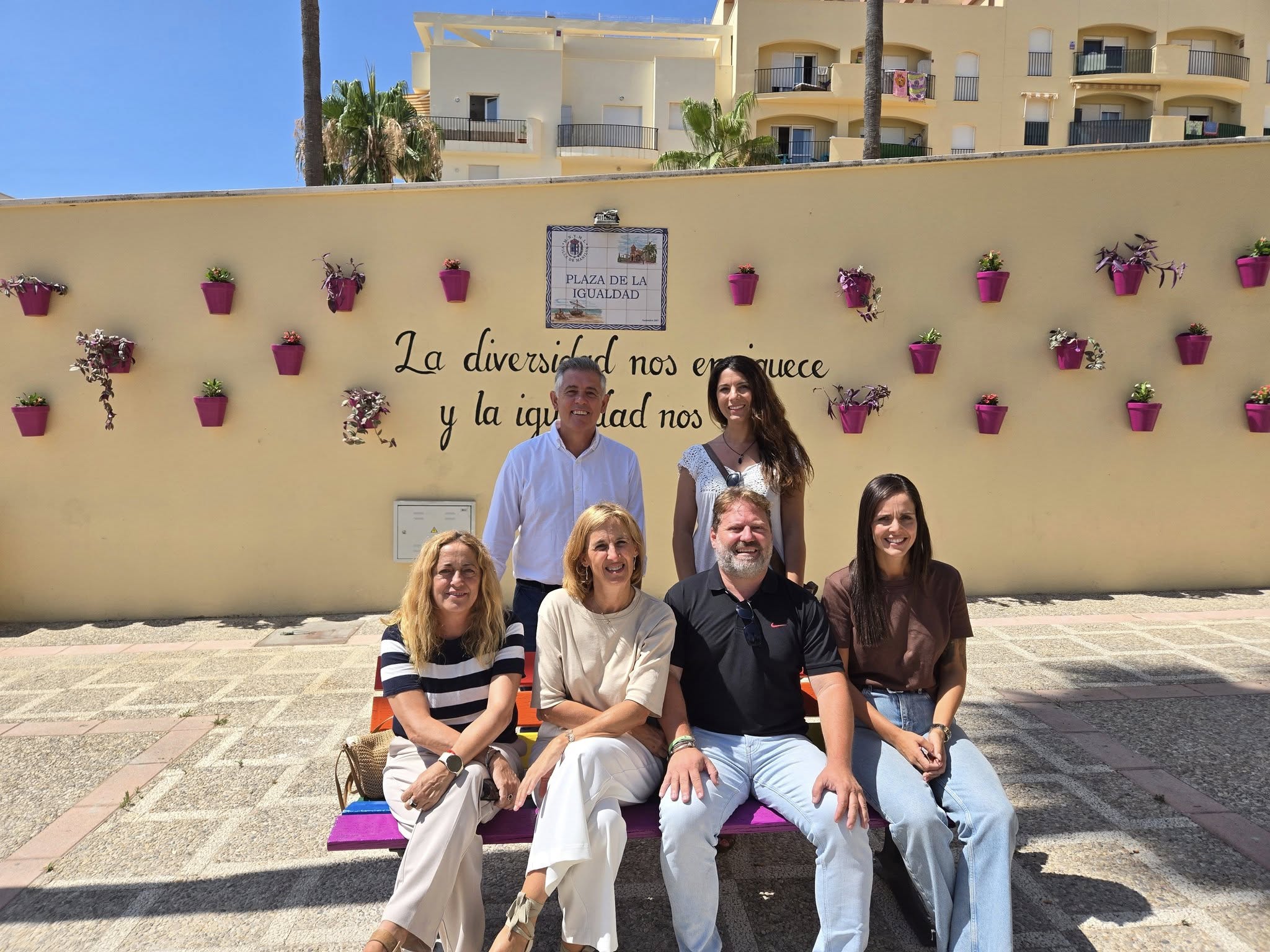 También ahora se pueden ver los bancos de colores con la bandera LGTBIQ+, así como macetas alrededor con la citada frase que resaltan el carácter de nuestra tierra.