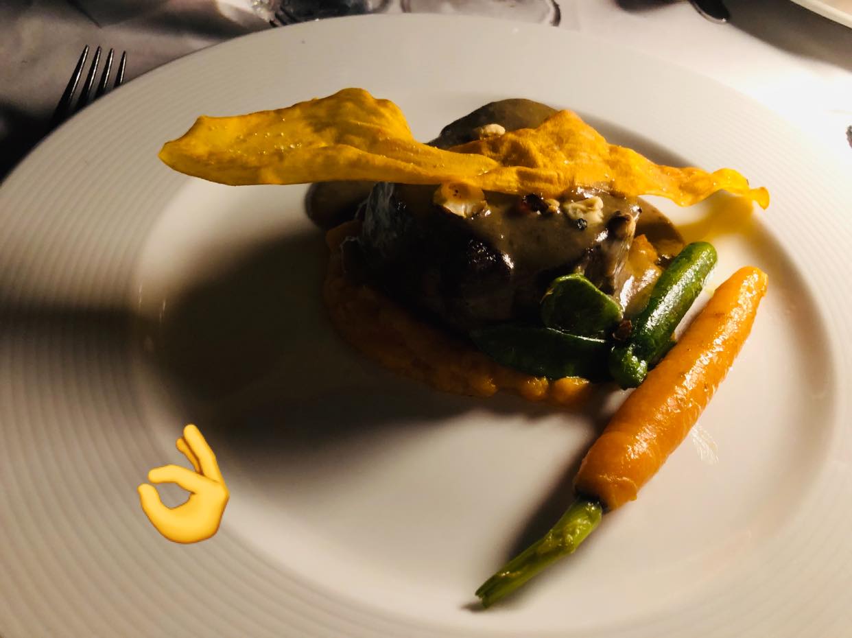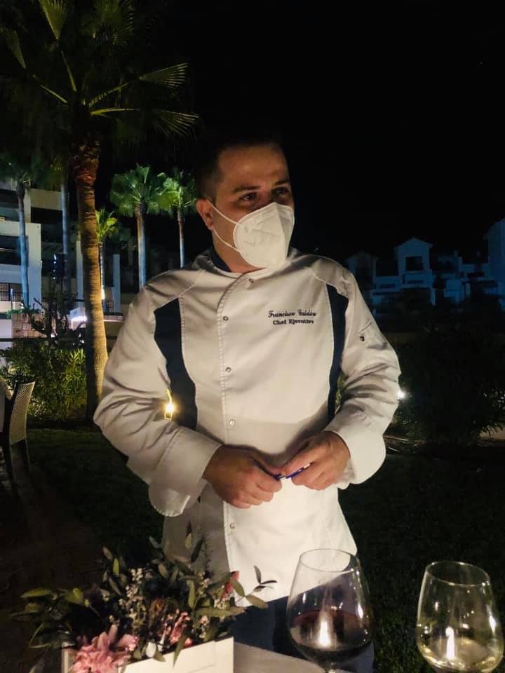 Noche de espléndida temperatura, excelente atención y servicio( coordinado por María del Carmen), agradable compañía y toda una «exhibición» del chef Francisco Galdón y su equipo para deleitar a las más de 40 personas que nos habíamos congregado en la zona de los jardines, al aire libre, cerca de la piscina y con la luz justita para la velada.