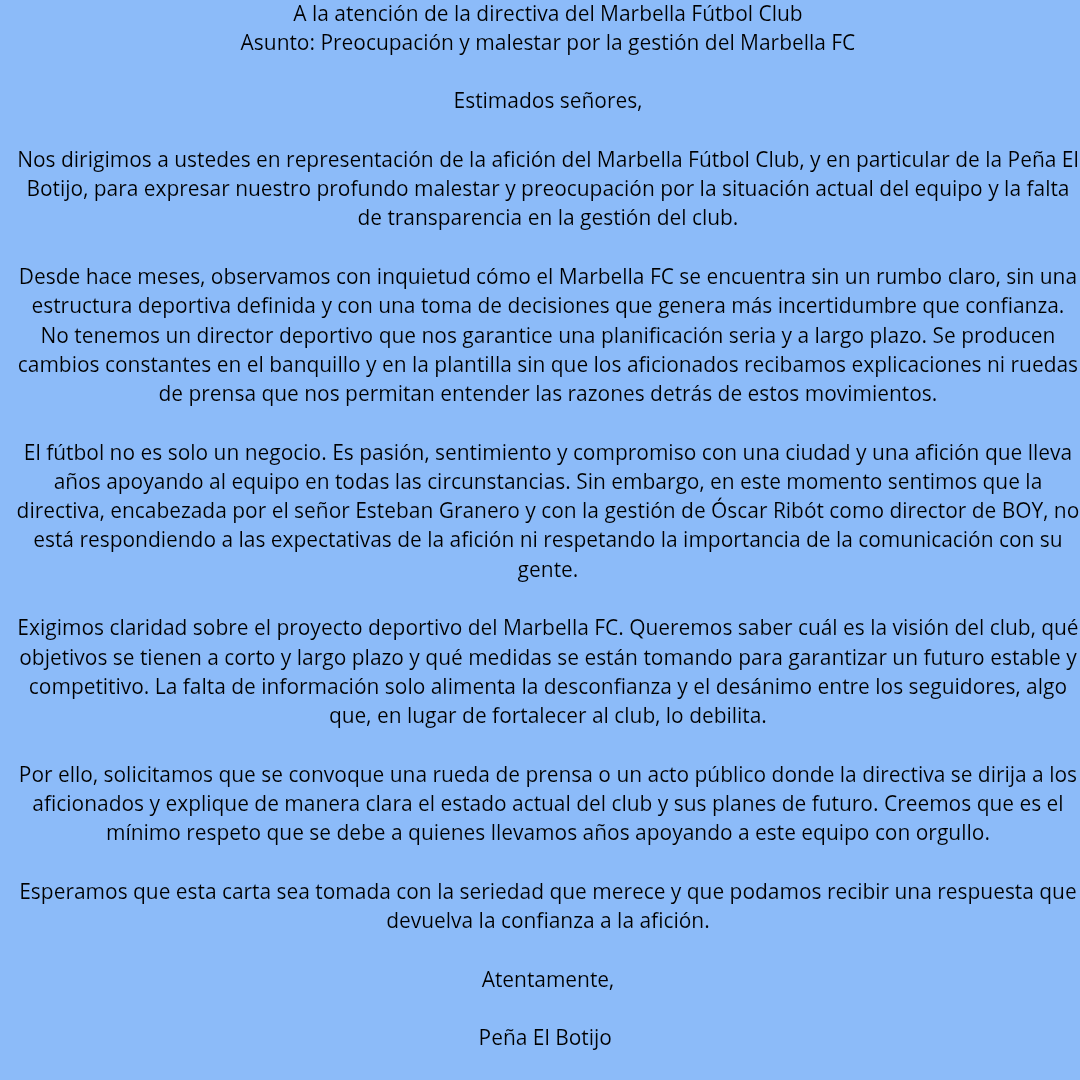 Nos dirigimos a ustedes en representación de la afición del Marbella Fútbol Club, y en particular de la Peña El Botijo, para expresar nuestro profundo malestar y preocupación por la situación actual del equipo y la falta de transparencia en la gestión del club.