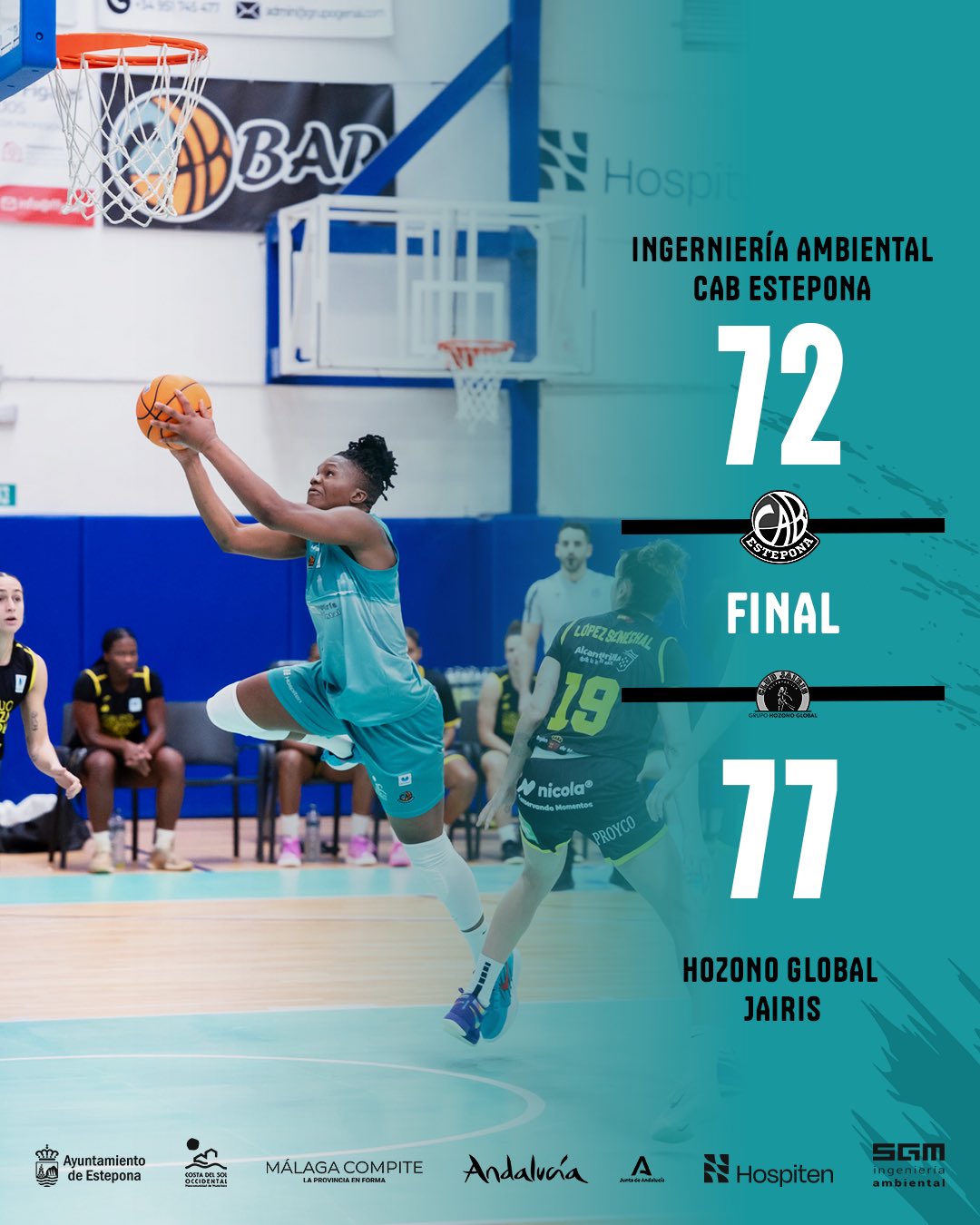 Ingeniería Ambiental CAB Estepona 72 (17-22-15-18): Gretter (7), Conner (11), Garrick (8), Rodríguez (0) y Kone (14) -quinteto inicial-, Contell (14), Dongue (16), Muhate (0), Bourgarel (-), Masiá (-), Gea (-) y Ortega (2).