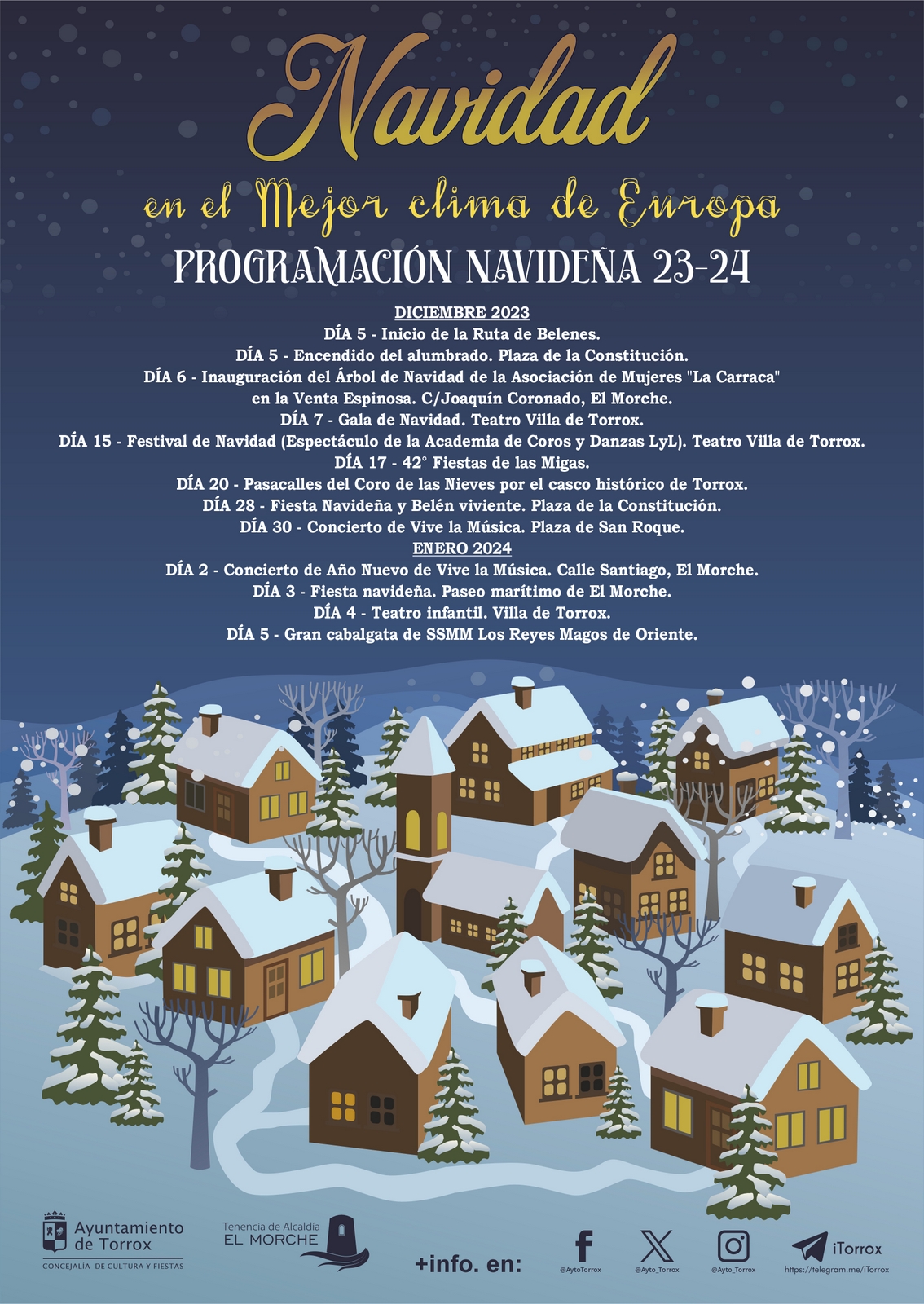 La Fiesta de Navidad comenzará con un pasacalles de la Agrupación Tecla y Borbón, tras el que actuará la Academia de Coros y Danzas de Lidia y Lucía. Las siguientes actuaciones correrán a cargo de los coros Nuestra Señora de las Nieves y Centro de Participación Activa (CPA) de Torrox, y Aires del Faro, del Centro de Día de Torrox Costa. Paralelamente, se escenificará el Belén viviente a cargo de la Asociación de Mujeres La Almedina de Torrox.