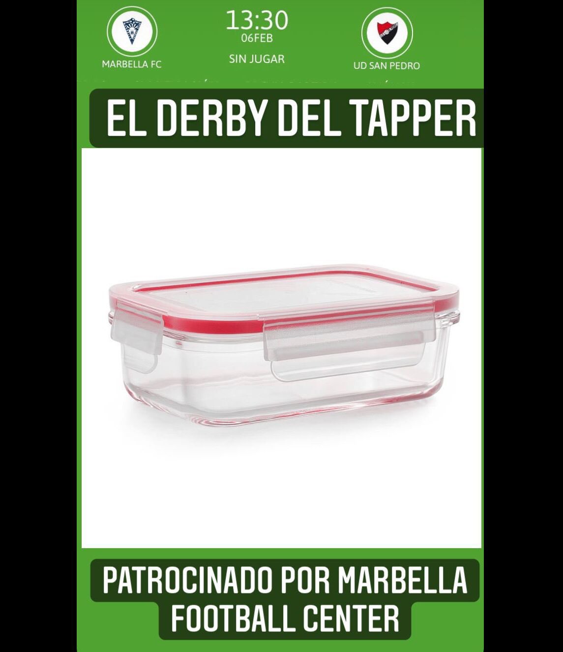 Este próximo domingo( 13´30 h) y de golpe se cambia a las 13h hoy está programado el derby futbolístico del municipio de Marbella. Un MARBELLA FC vs UD SAN PEDRO en 3ª RFEF. Y además con el extra del resultado en la primera vuelta( victoria rojinegra por 1-0 ). El horario no ha gustado nada a ninguna de las dos aficiones. Con ver las Redes Sociales se puede comprobar. En Twitter y Facebook las memes están creciendo día a día.