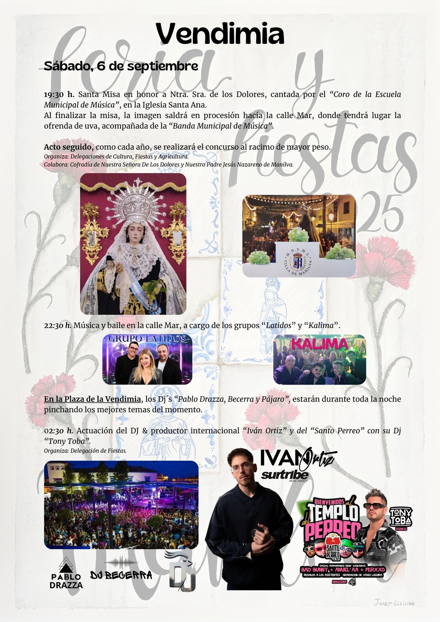 El sábado 6 de septiembre, la Santa Misa en honor a Nuestra Señora de los Dolores tendrá lugar a las 19:30 horas en la iglesia de Santa Ana. Tras la ceremonia, la imagen recorrerá las calles hasta la calle Mar, escenario de la tradicional ofrenda de uvas y del concurso al racimo de mayor peso.