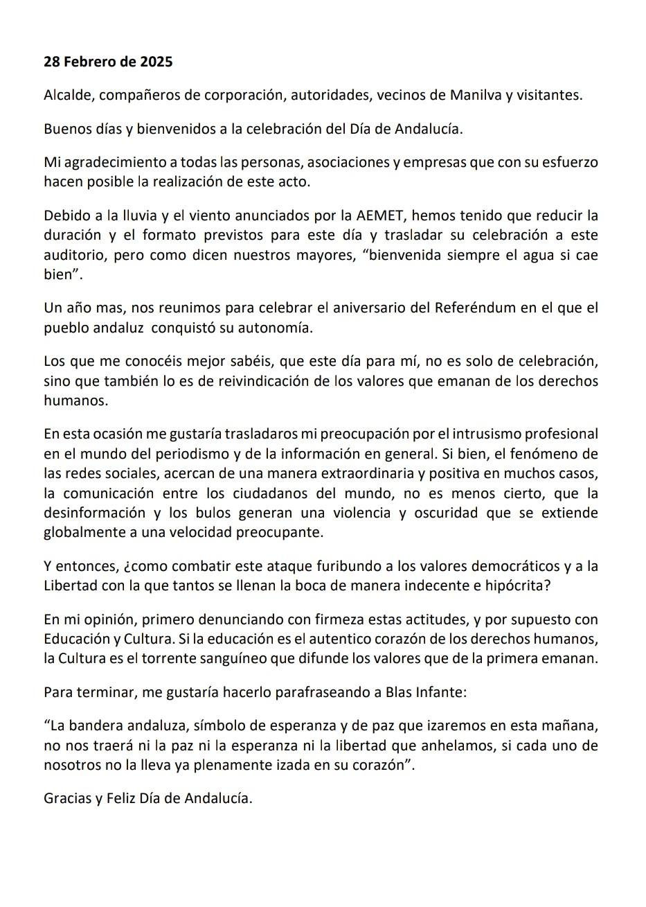 Debido a las lluvias y las tormentas que cayeron en el municipio de Manilva este 28F Día de Andalucía ha tenido un formato y unas características distintas a las habituales. El acto oficial se trasladó al salón de actos del CIVIMA y fue de menos duración. Intervinieron el alcalde( José Manuel Fernández) y la concejala de Educación y Cultura( Eva Galindo ). Posteriormente se procedió a la izada de la bandera andaluza y a la interpretación del himno de Andalucía a cargo de los miembros de la Escuela Municipal de Música, Danza y Teatro de Manilva. En el acto estuvieron todos los concejales de la actual Corporación Municipal.