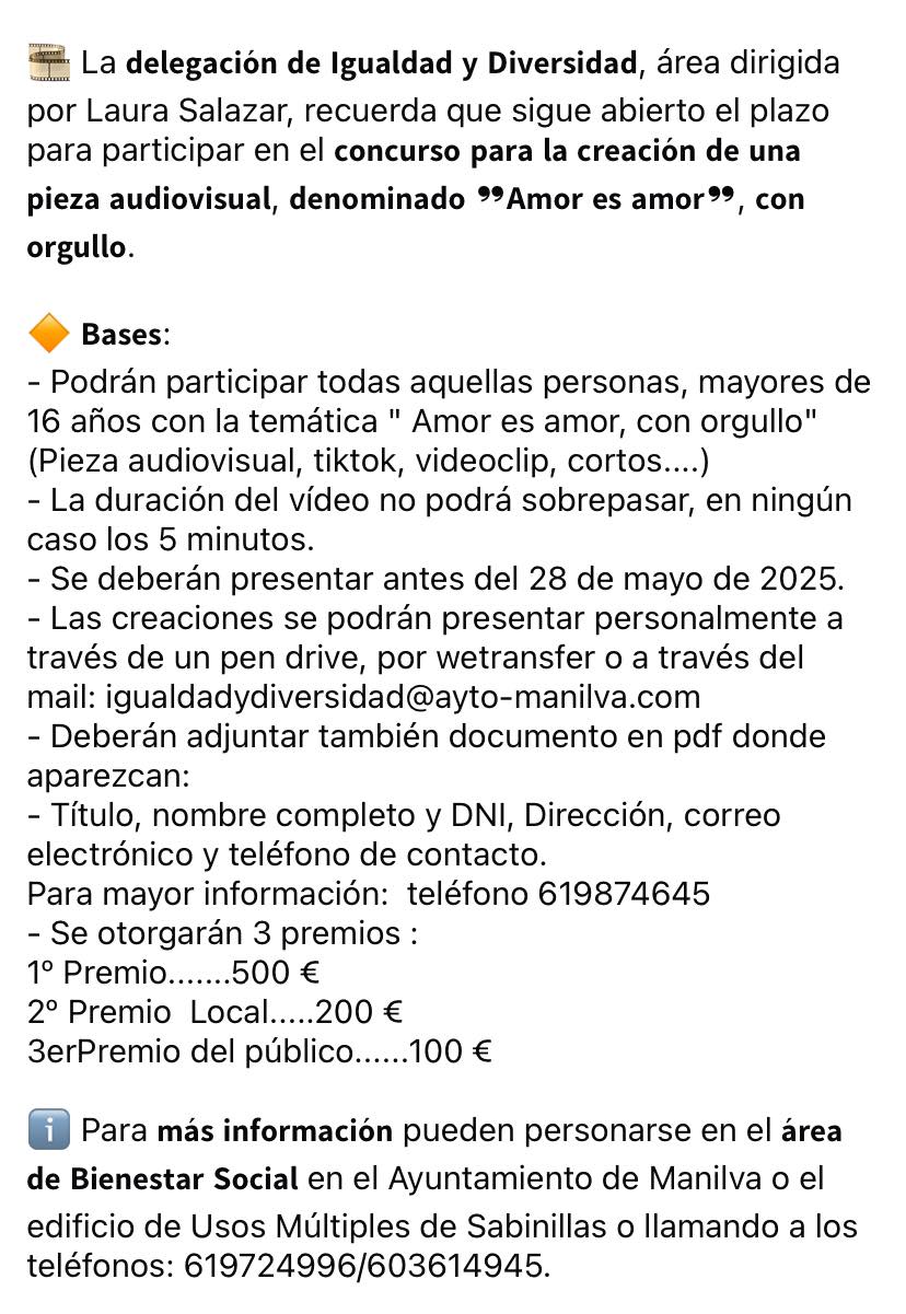 La Delegación de Igualdad y Diversidad del Ayuntamiento de Manilva, dirigida por la concejaña Laura Salazar( Compromiso Manilva ), ha puesto en marcha un Concurso de piezas audiovisuales. Su lema es «Amor con amor» con orgullo. Se admiten piezas en Tiktok, videoclips, cortos, que no superen los cinco minutos en total.