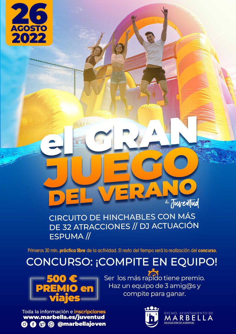 El Ayuntamiento de Marbella, a través de la delegación de Juventud, celebrará este viernes, 26 de agosto, ‘El gran juego del verano’, una gymkana con más de 23 atracciones repleta de pruebas y retos y con premios para los equipos más rápidos. El concejal del ramo, Enrique Rodríguez, ha explicado que la cita tendrá lugar este viernes de 10 a 20 horas ininterrumpidamente en el campo de fútbol anexo al Pabellón Antonio Serrano Lima, con acceso directo desde la calle Vicente Blasco Ibáñez. La jornada se dividirá en dos tipos de actividades gratuitas: desde las 10 a las 17 horas usuarios de entre 11 y 35 años podrán hacer un uso libre de las atracciones y practicar en el circuito, mientras que de 17 a 20 horas tendrán lugar el desarrollo del concurso competitivo, en este caso para participantes de entre 14 y 35 años.