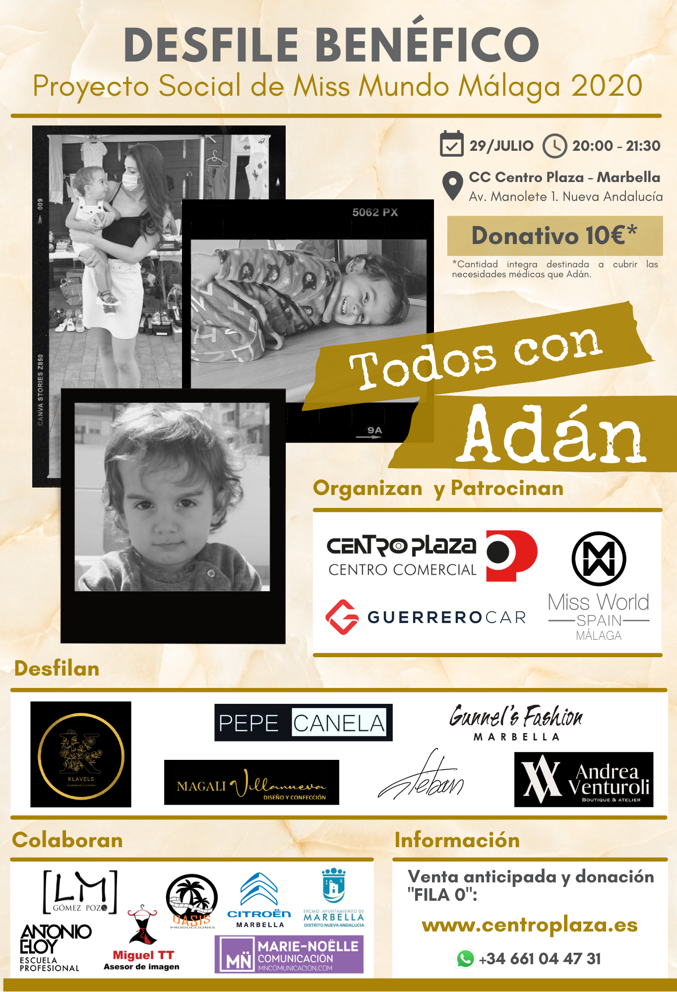 ‘Todos con Adán’ es un gran proyecto solidario iniciado y presentado en la edición de Miss Mundo España 2020, por la actual Miss Mundo Málaga Blanca Aguilera, siendo su proyecto social para su año de reinado. El desfile que contará con una pasarela de 85 metros de largo, tiene como patrocinadores a CC Centro Plaza y Guerrero Car y cuenta con la colaboración de Antonio Eloy Escuela, Oasis Producciones, Miguel TT Asesor de Imagen, Citroën Marbella, MarieNoëlle Comunicación y Excmo. Ayuntamiento de Marbella.