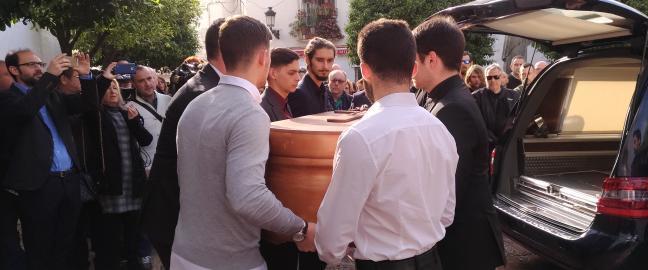 La salida del féretro fue con los monaguillos, sus antiguos compañeros en la Encsrnación, como portadores. Con aplausos y su grito de «Siempre fuertes» salió con destino al Cementerio, acompañado de sus familiares e íntimos, visiblemente tocados. Las lágrimas han sido constantes de todos los que allí nos encontrábamos por lo que ha representado en su lucha por la donación de médulas.