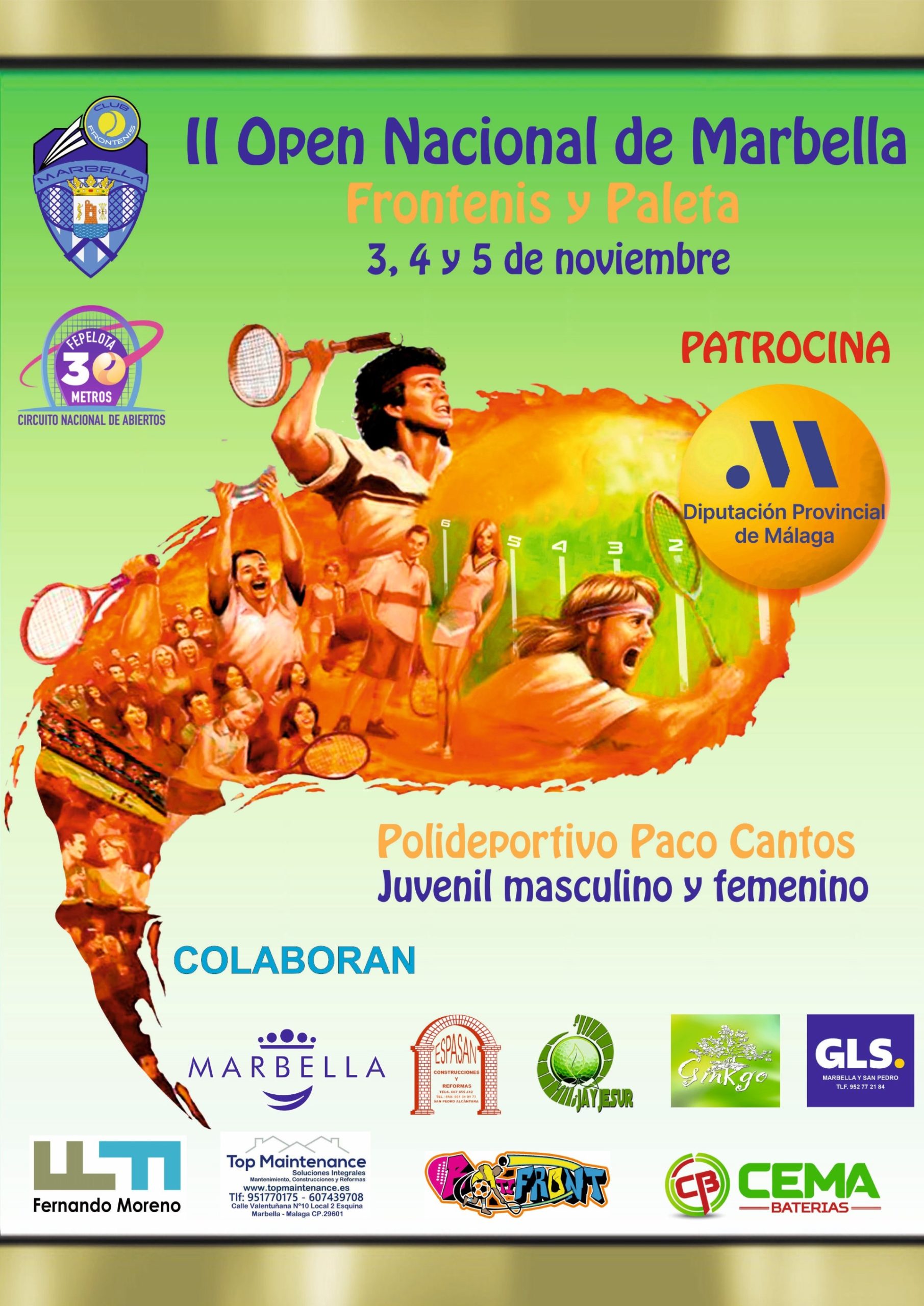 El edil ha señalado que la prueba será puntuable y cerrará la temporada del circuito nacional. “Después del éxito del pasado año, en esta edición se disputará el doble de partidos y participarán más jugadores”, ha detallado Vieytes, quien ha animado a acercarse a los amantes de esta disciplina hasta las pistas del Paco Cantos “para disfrutar de este atractivo deporte”. Por su parte, el presidente del Club Frontenis de Marbella, Miguel Rodríguez, ha detallado que habrá un total de 77 enfrentamientos y que las finales se disputarán el domingo, 5 de noviembre. Además, ha agradecido el apoyo tanto del Ayuntamiento como de la Diputación Provincial para la celebración de este torneo.