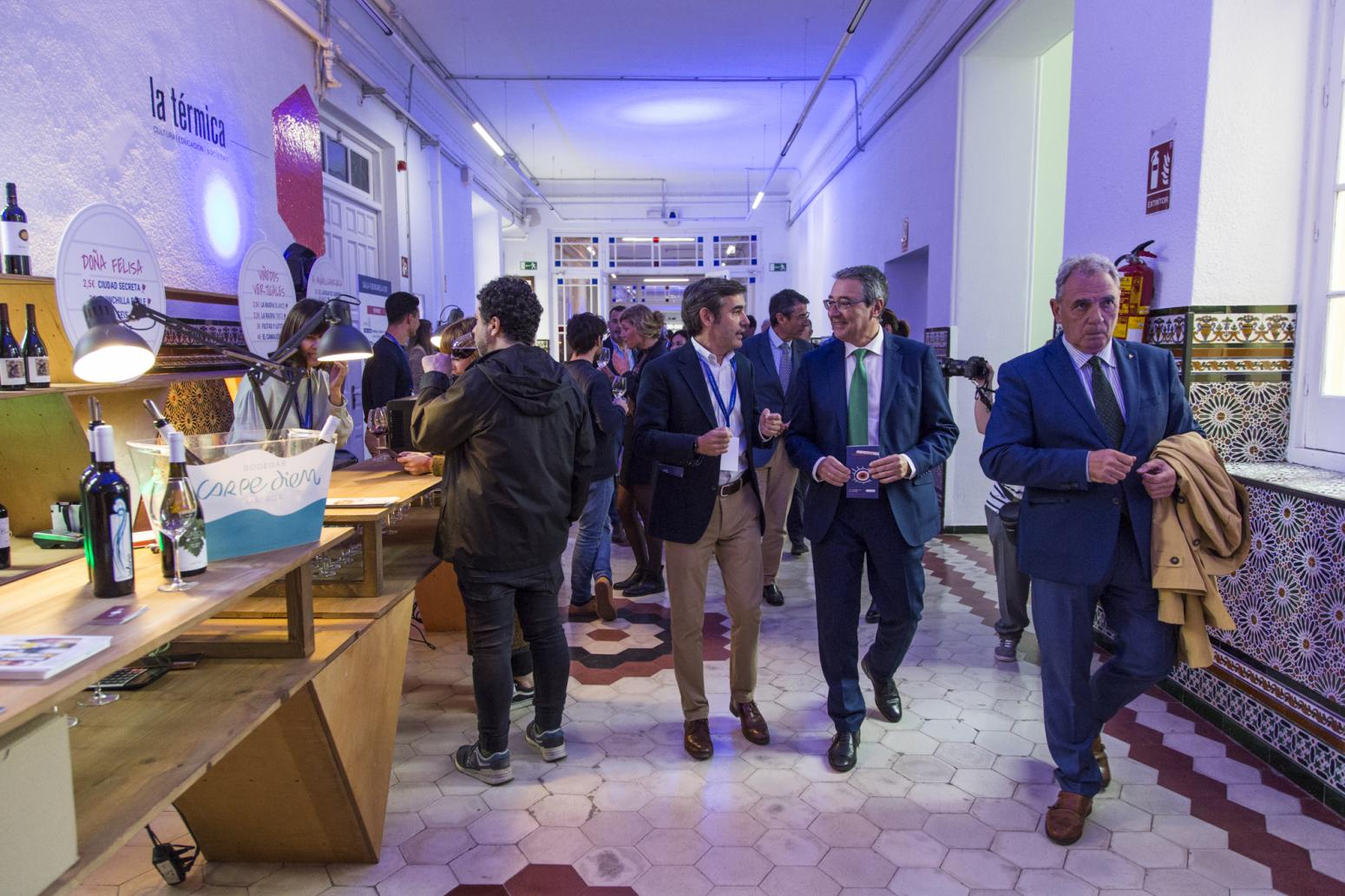 El presidente de la Diputación, Francisco Salado, junto al presidente del Consejo Regulador, José María Losantos, y el delegado territorial de Agricultura, Pesca, Agua y Desarrollo Rural de la Junta de Andalucía, Fernando Fernández-Tapia, ha inaugurado hoy el evento en las instalaciones de La Térmica.