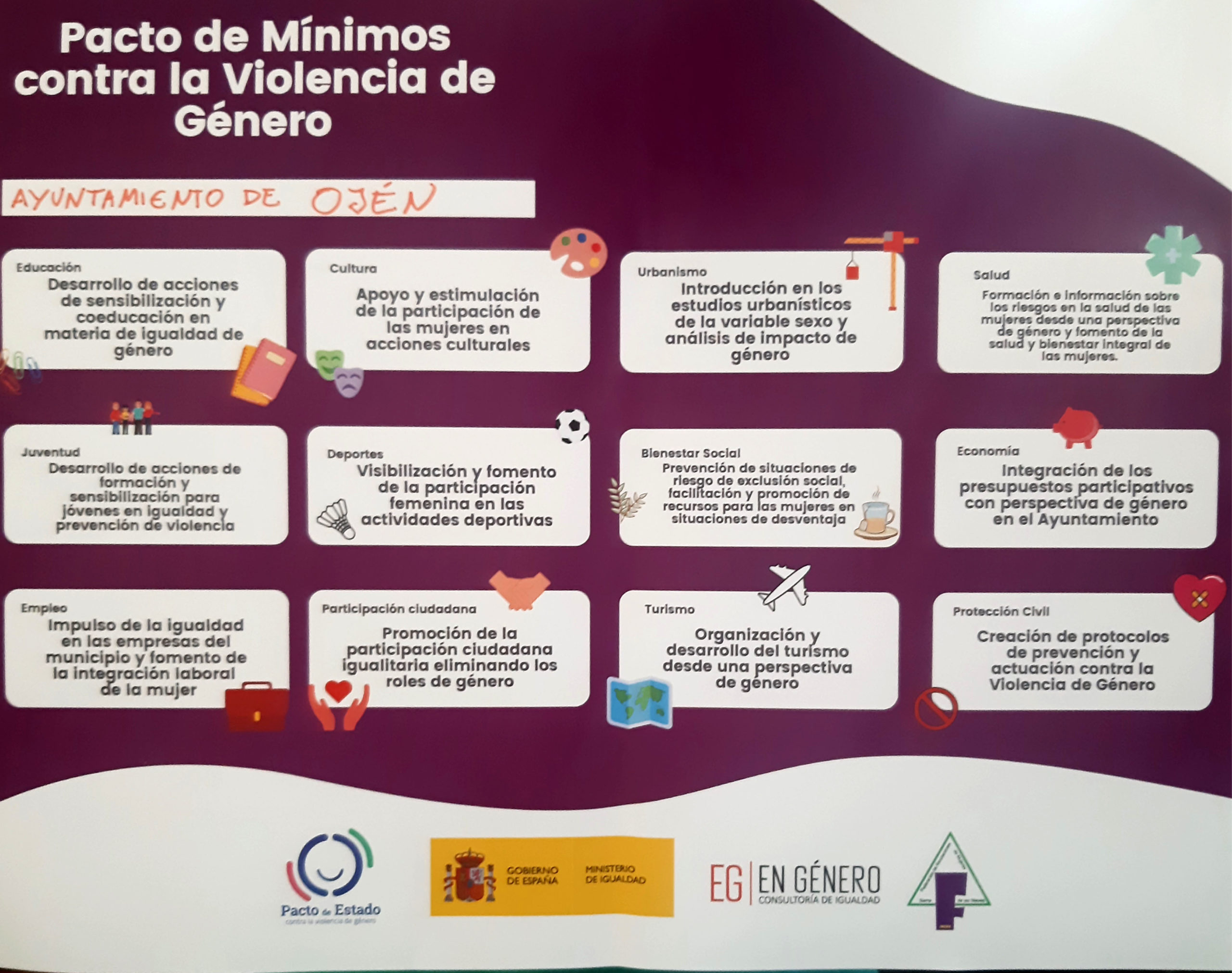 Este pacto de mínimos se concreta en medidas de igualdad en 12 áreas: educación cultura, juventud, deportes, empleo, participación ciudadana, urbanismo, salud, bienestar social, economía, turismo y protección civil. Todo ello se engloba dentro del Pacto de Estado contra la violencia de Género.