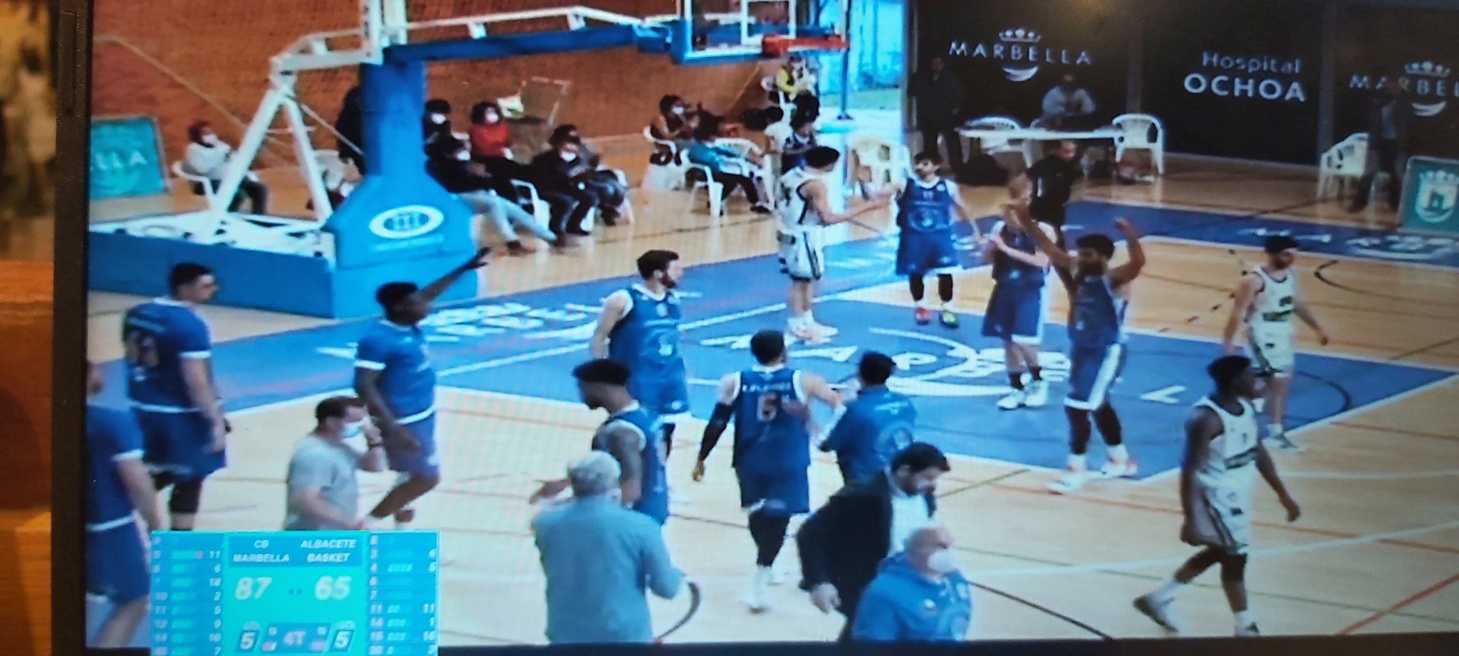 Pero en el tercer cuarto regresó el «huracán azul». En apenas cinco minutos el CB Marbella se colocó 60-36 en el luminoso. El tiro exterior era magnífico y dio alas a los locales que en el minuto 30 vencían 67-41. Quedaba el último cuarto y ahí el equipo visitante tenía que jugársela para enjugar la diferencia. Algunos errores en los pases y quizás una innecesaria precipitación en el control del balón por el CB Marbella dio alas a los manchegos que tiraban desde lejos y buscaban penetraciones con faltas para ir rebajando el score. Del 74-47( minuto 34) se pasó a un 80-67( minuto 38 ). Ahí pidió tiempo muerto Rafa Piña y reordenó la situación. De ahí al final los puntos de Knudsen y la briega de Wright colocaron el definitivo 87-65 en el marcador. Una diferencia que debería servir a los azulones para pasar a los cuartos de final de este playoff. Ahora tocará jugar en Albacete con mucha cabeza y mucho basket control. La presión está en el rival.