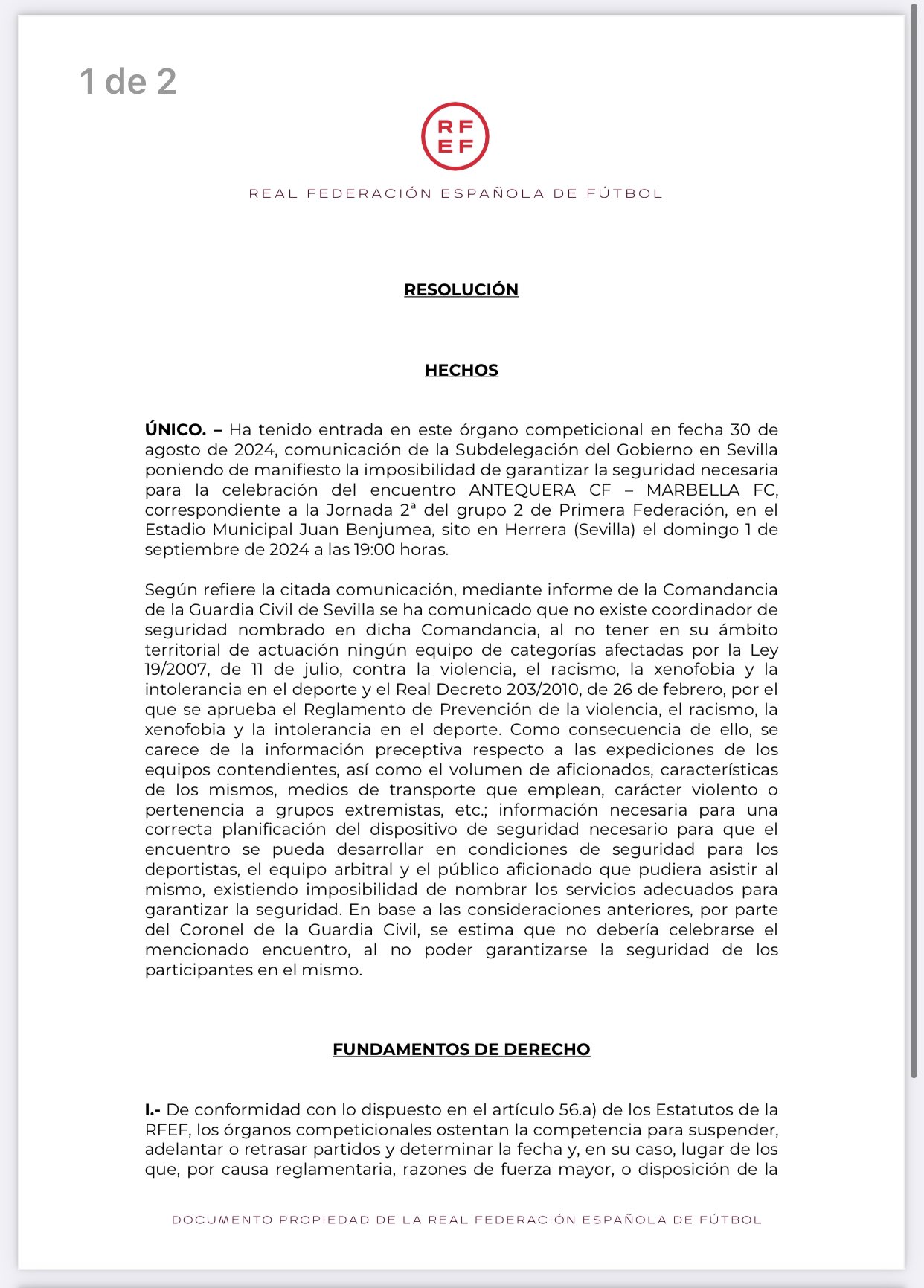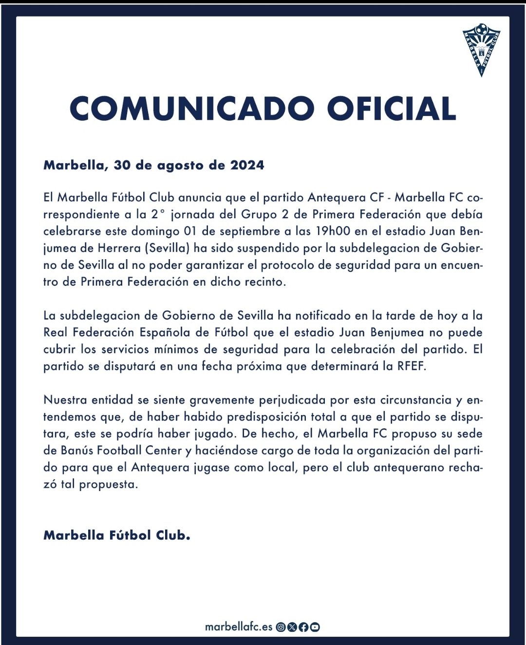 La nota dice: «La RFEF ha comunicado al club( Antequera CF ) la decisión de aplazar el Antequera CF-Marbella FC, fijado en un principio para su disputa el próximo domingo 1 de septiembre a las 19h en el Estadio Municipal Juan Benjumea( Herrera). Por lo tanto, queda suspendido el viaje gratutito organizado por el club a la localidad de Herrera. El encuentro queda pendiente de nueva fecha y horario».