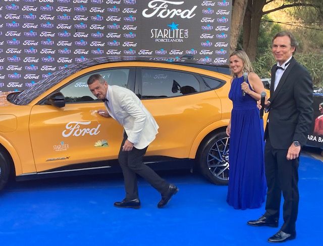–El autógrafo de Banderas sobre un Mustang Mach-E GT, de «color azafrán». Ford colabora año tras año con la Fundación Starlite.