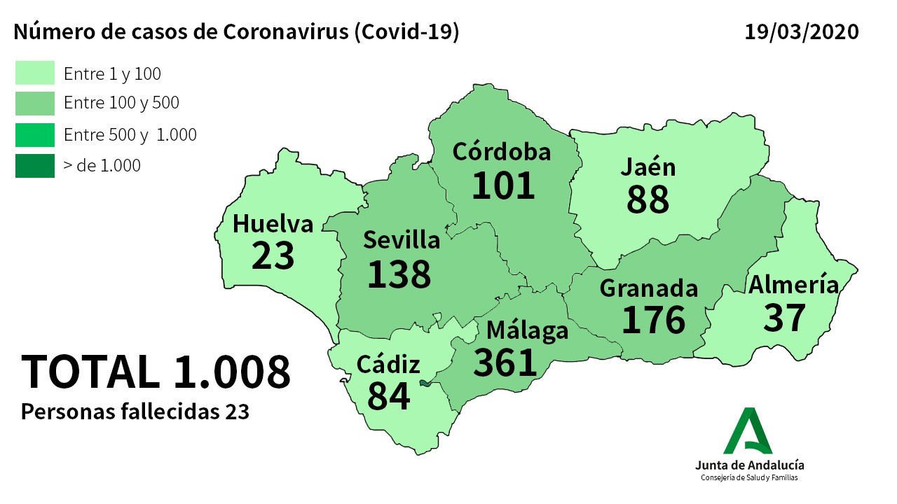 La Consejería de Salud y Familias de la Junta de Andalucía informa que se han confirmado en Andalucía 149 nuevos casos de Coronavirus en las últimas horas. Así, el número total de afectados en Andalucía asciende a 1008.