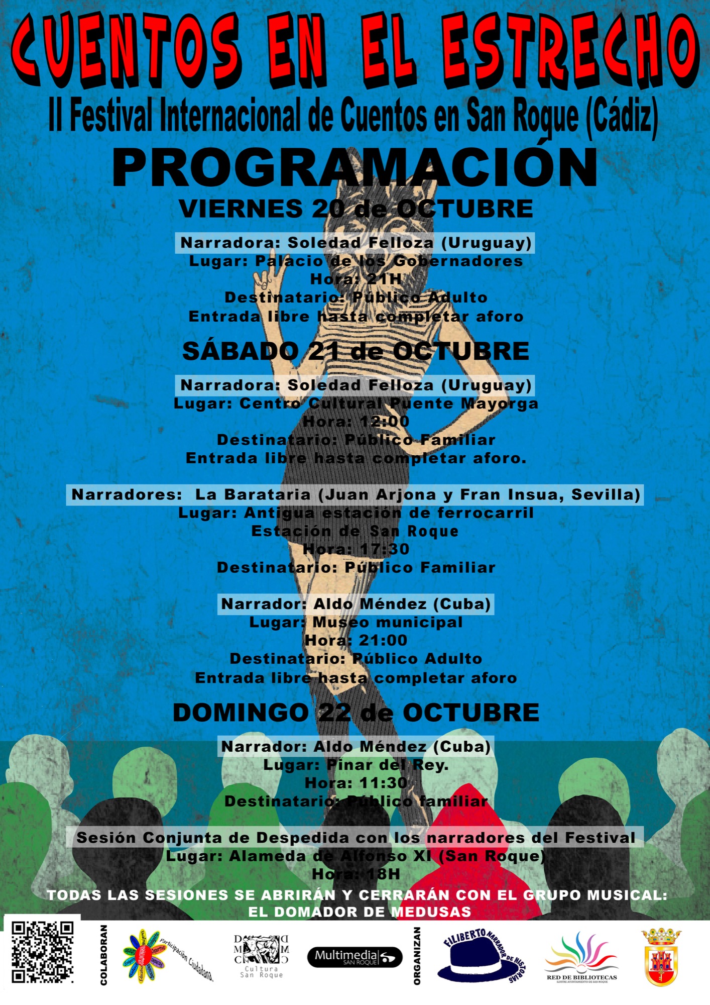La primera de las sesiones será el viernes 20 en el Palacio de los Gobernadores, a cargo de la narradora uruguaya Soledad Felloza, que es directora del Festival Internacional de Narración Oral Atlántica, con sede en Galicia. La cita será a las 21.00 horas, y se dirige a público adulto. Como en el resto de la propuestas, la entrada será libre hasta completar aforo, y cada una de las sesiones se abrirán y cerrarán con el grupo musical “El domador de medusas”.