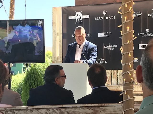 El viceconsejero de Turismo y Deporte de la Junta de Andalucía, Diego Ramos, ha presidido hoy la presentación oficial del 47º Torneo Internacional de Polo, que se disputará hasta el próximo 1 de septiembre en el Santa María Polo Club (SMPC). La competición, en la que participan 18 equipos, reúne en Sotogrande a los mejores polistas del mundo. Se han programado un centenar de partidos y una amplia oferta de ocio para todos los públicos, que incluye gastronomía, compras, música y atracciones infantiles. Ramos expresó en su intervención “todo el apoyo de la Junta” al nuevo proyecto hípico del SMPC, que explicó durante el acto el presidente del SMPC, Antonio Ortiz.