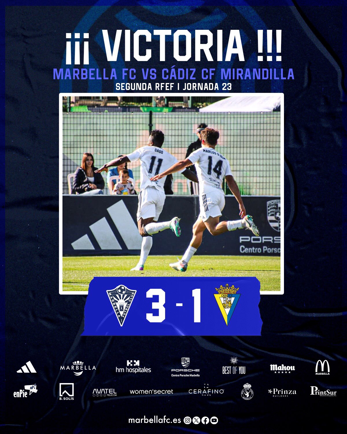 Importante victoria del Marbella FC( 3-1 ) ante el Cádiz Mirandilla en una jornada con excelentes resultados para sus intereses. Se coloca tercero en la tabla y le recorta ventaja a los dos primeros clasificados. En su debe el último cuarto de hora que se ha visto superado por los amarillos, que marcaron su gol y generaron acciones de peligro ante Lejárraga.