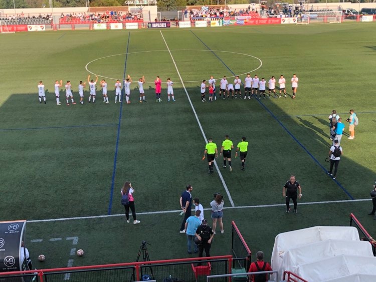 Nada más llegar a los alrededores del Estadio Municipal Antonio Naranjo se notaba que era un partido distinto. Colorido, ambiente, seguidores blanquillos y casi un millar de espectadores en las gradas. Afortunadamente no se han producido incidente serios, al margen de los típicos piques en los cánticos. Una notable presencia policial fue efectiva.