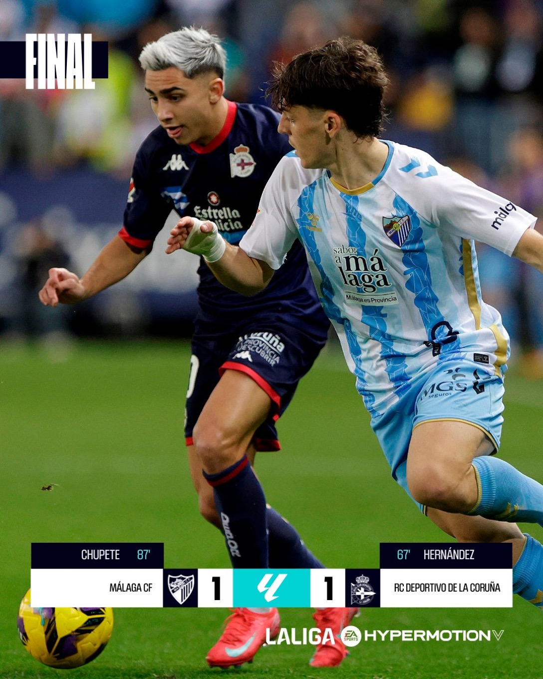 Primer partido de LALIGA HYPERMOTION en 2025 para el Málaga CF y el RC Deportivo, que iniciaban la segunda vuelta de la competición en La Rosaleda ante 27.281 malaguistas. En el césped, el siguiente once: Alfonso Herrero; Gabilondo, Pastor, Nelson Monte, Dani Sánchez; Antoñito C., Luismi, Manu N. Molina, Kevin Medina; Lobete y Dioni formaron de partida.