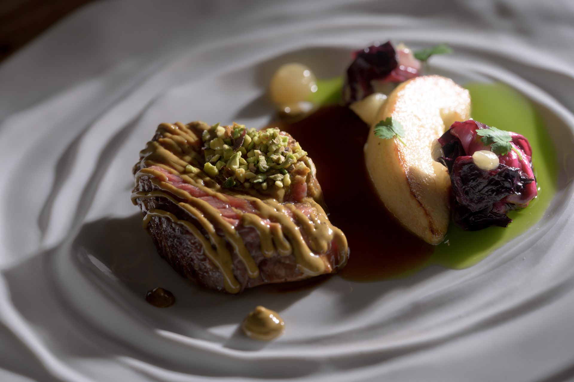 Para continuar, un Virrey a la plancha, Ravioli de berenjena y salsa de maracuyá, realzando así la delicadeza del pescado con notas afrutadas.
