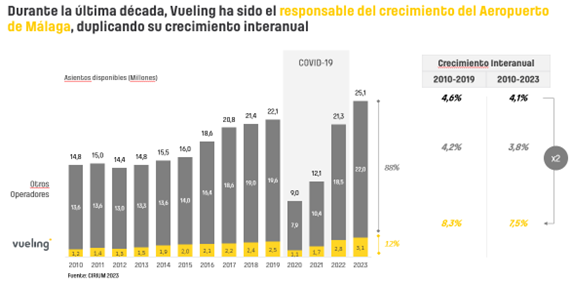 Con una cuota de mercado del 12,7% y seis aviones basados, Vueling ha destacado en el transporte aéreo de la región, siendo líder en el mercado doméstico en el Aeropuerto de Málaga con una cuota de 42 % en 2023. La compañía ha trasladado cerca de 3 millones de pasajeros y ha operado más de 16.000 vuelos en 2023. Asimismo, desde 2005, Vueling ha operado más de 160.000 vuelos con origen o destino en Málaga.